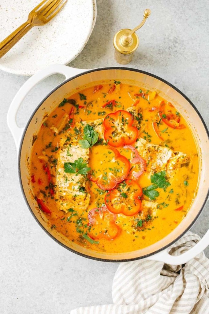 Em uma panela grande, coloque o peixe, a cebola, os pimentões, os tomates e polvilhe coentro.